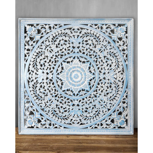 Carved Full Bed Headboard "Peony" - Blue Wash- USA