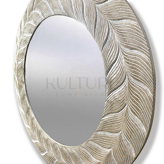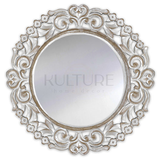 Hand Carved Mirror "Wanasari" in White Wash - 70 cm