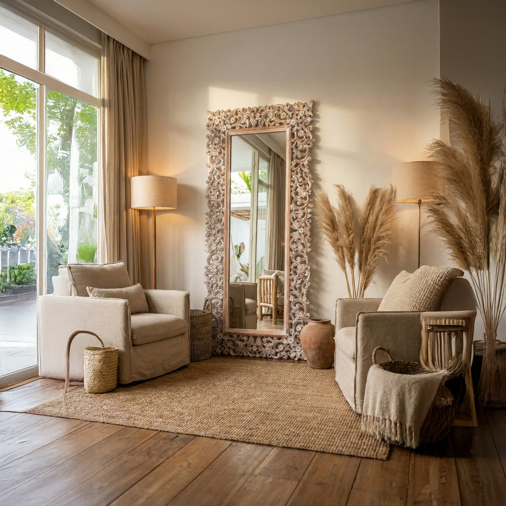 Hand Carved Mirror "Cahaya" in Antic Wash - 150 cm
