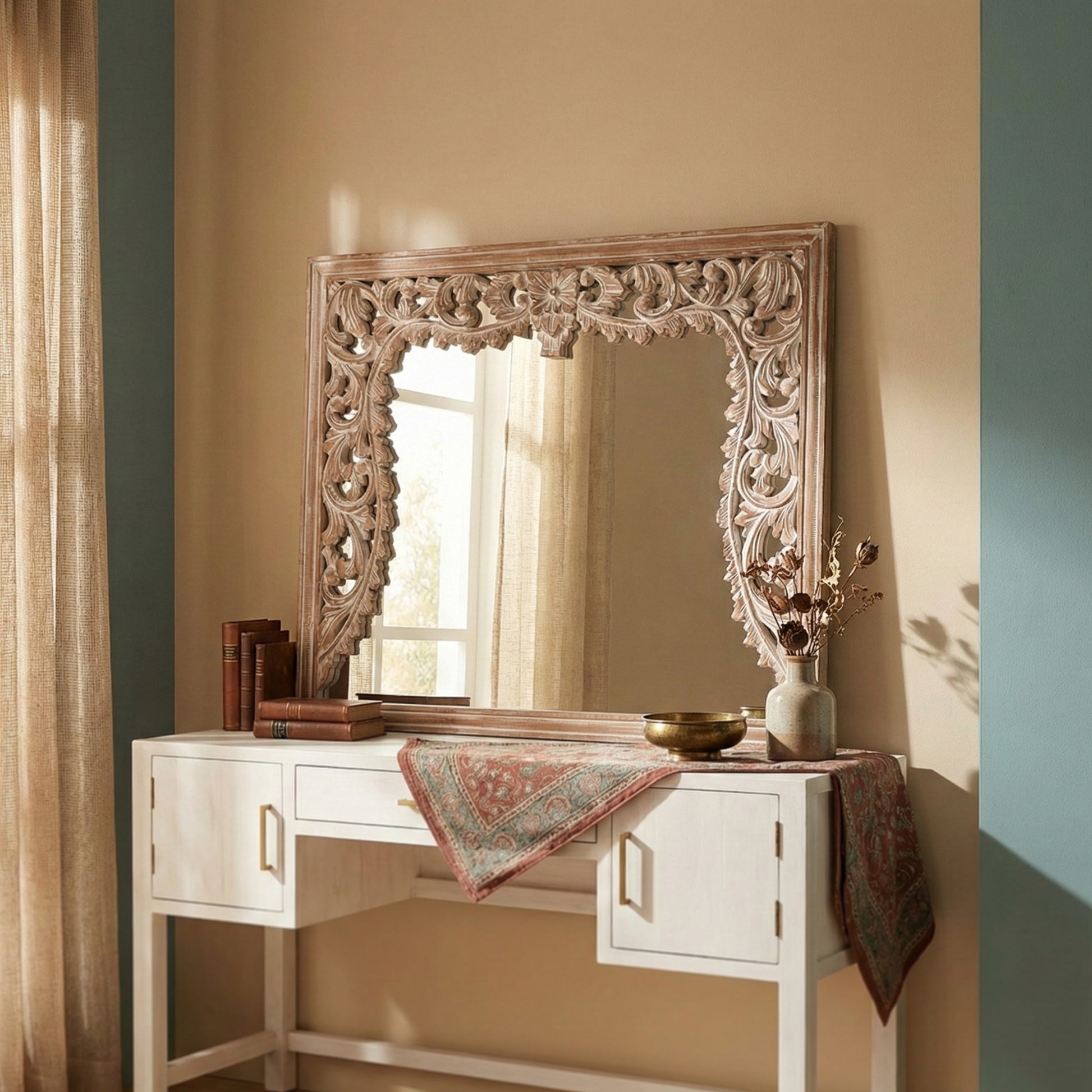 Due to the handcrafted nature of this mirror, slight variations in carving, color, and finish may occur, enhancing its authentic character.