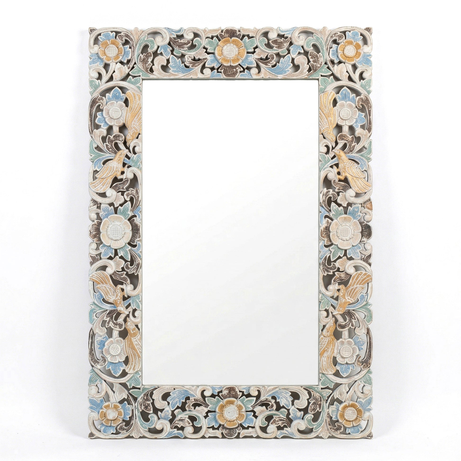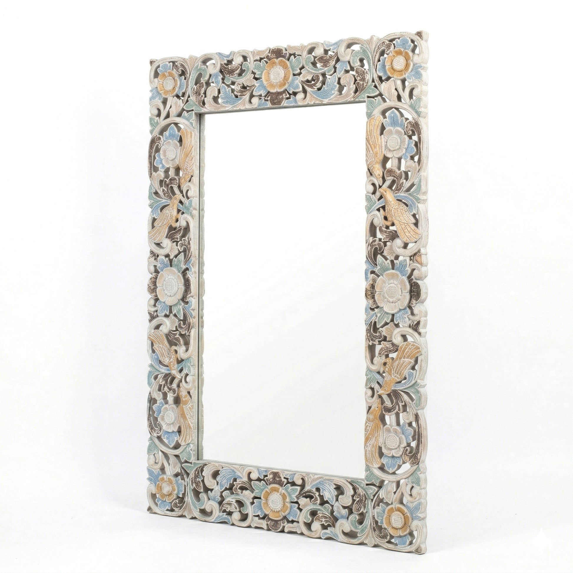 Carefully carved by Balinese artisans, this mirror features delicate flower and bird motifs—symbols of growth, harmony, and freedom. Each detail is shaped by hand, reflecting generations of craftsmanship where every curve and line carries intention.