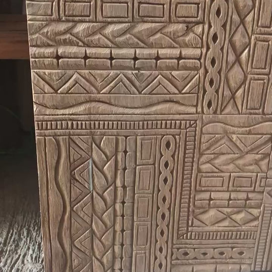 Celebrate the richness of Indonesian heritage with the 'Nusantara' Wooden Carved Sideboard Console Cabinet, a striking statement piece handcrafted by skilled artisans in Java, Indonesia. Each console is meticulously hand-carved, revealing amazing details inspired by traditional motifs passed down through generations.