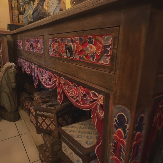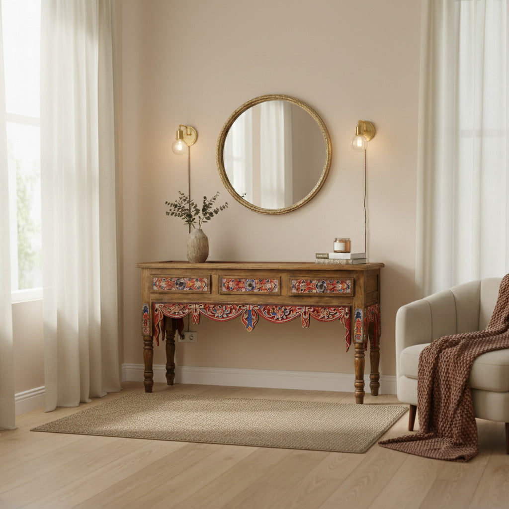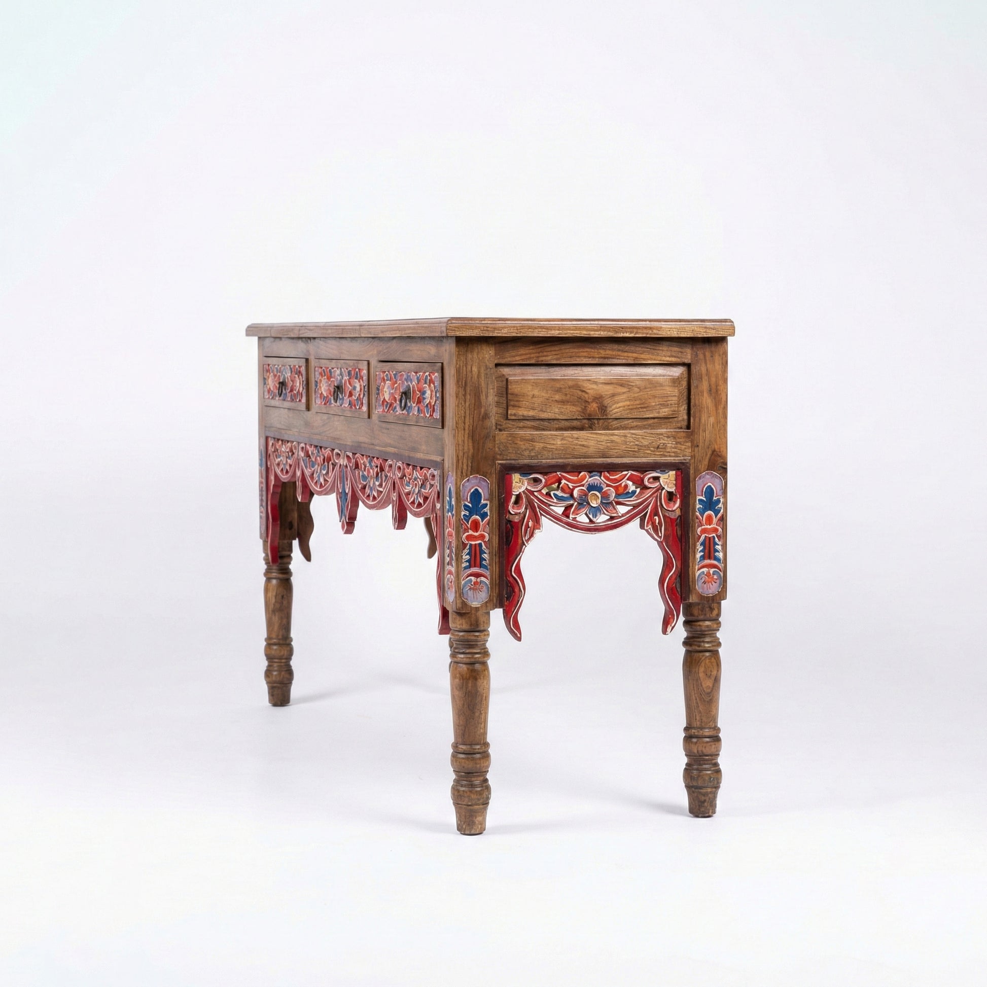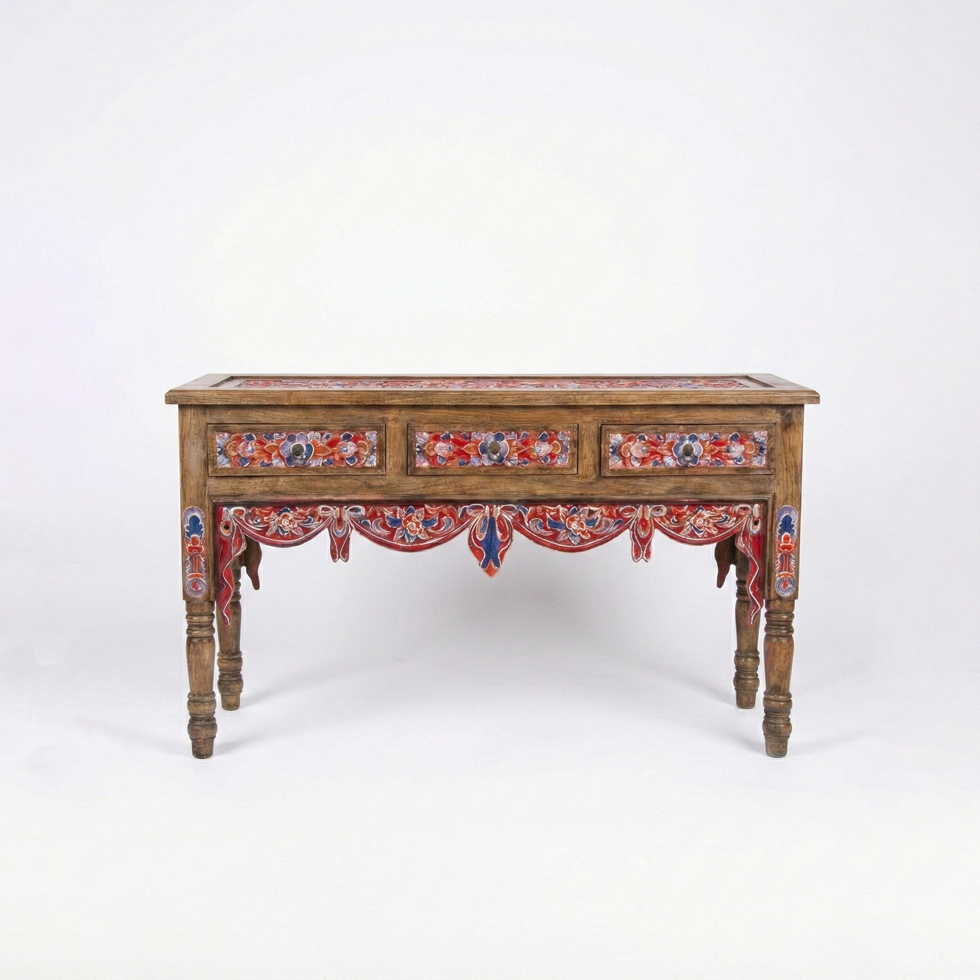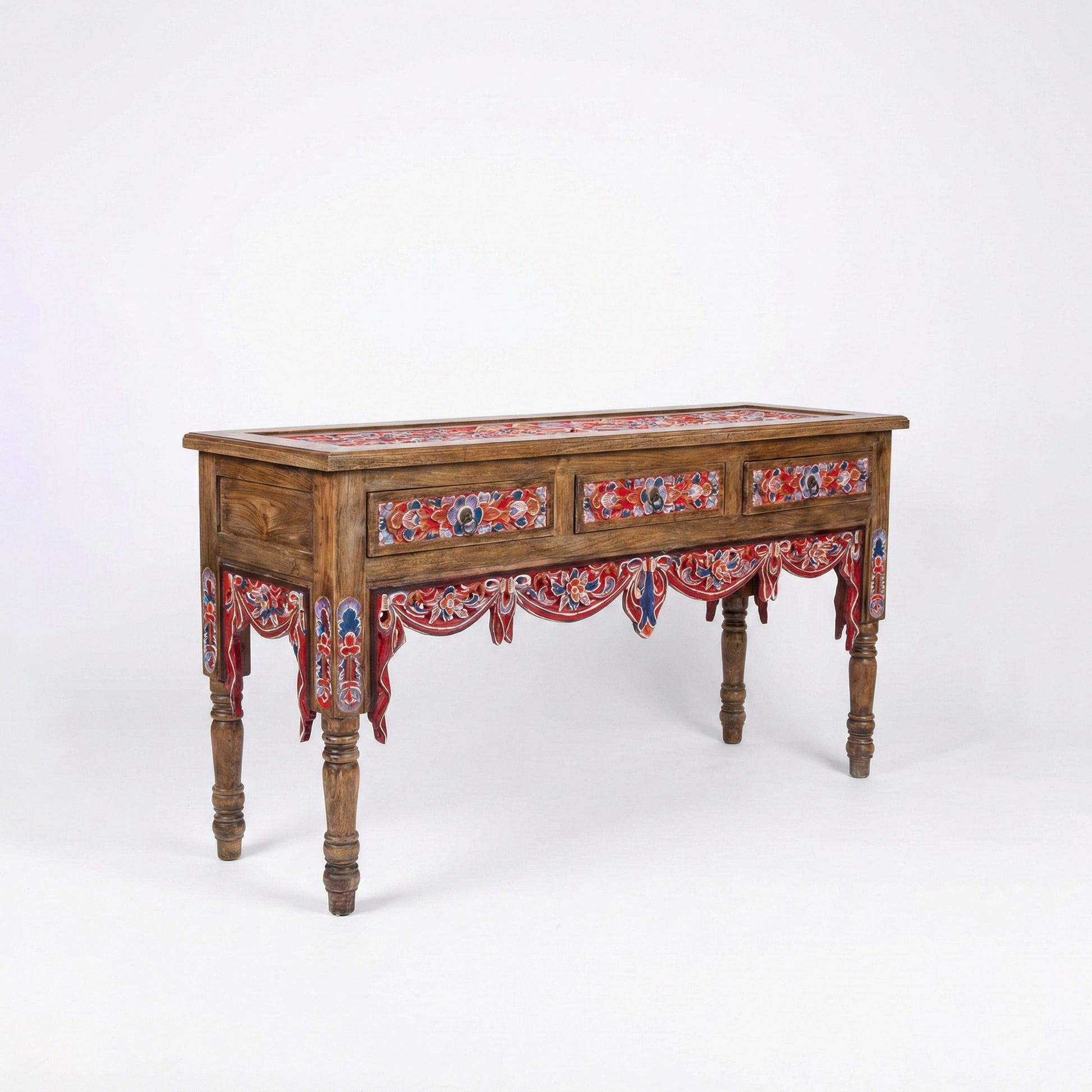 Add warmth, artistry, and character to your home with this beautifully handcrafted carved console table. Featuring intricate hand-painted floral detailing in rich red and blue tones, this piece blends traditional craftsmanship with rustic elegance.